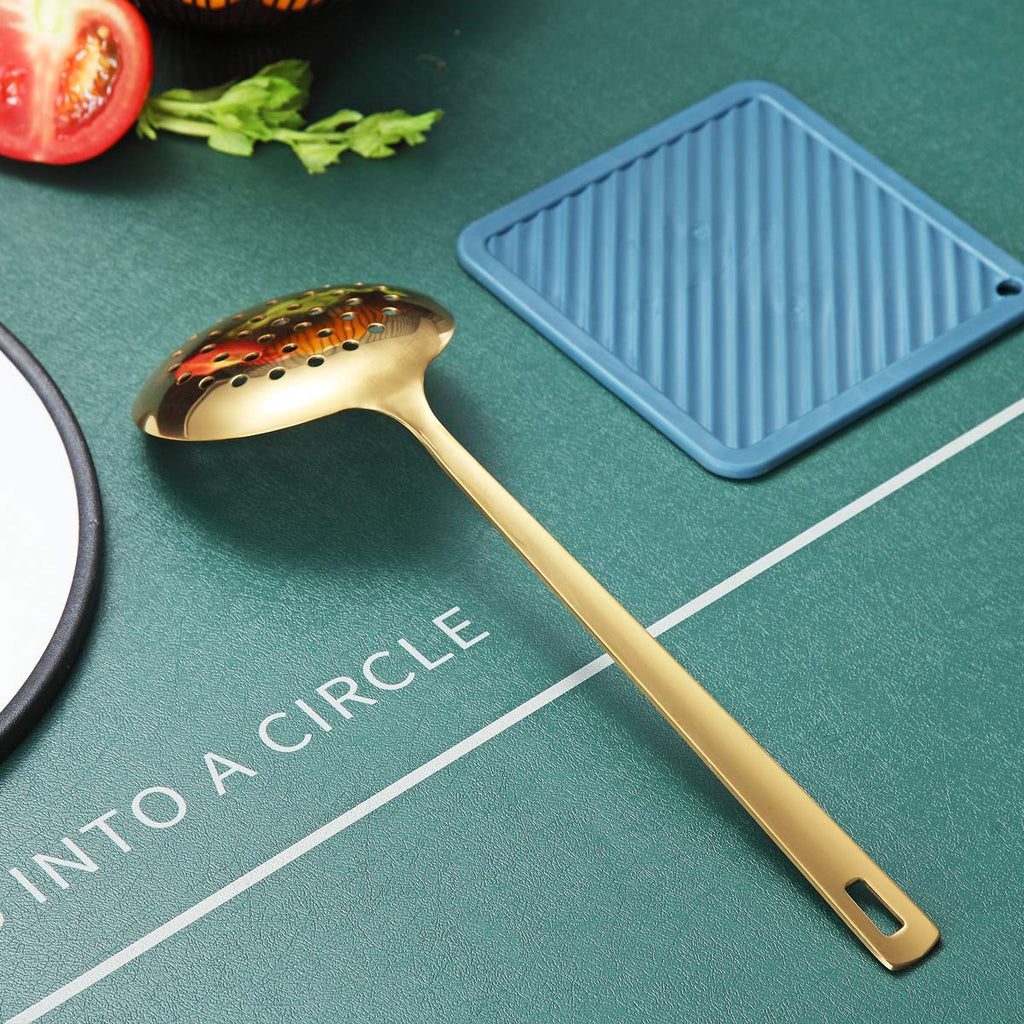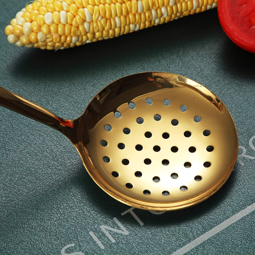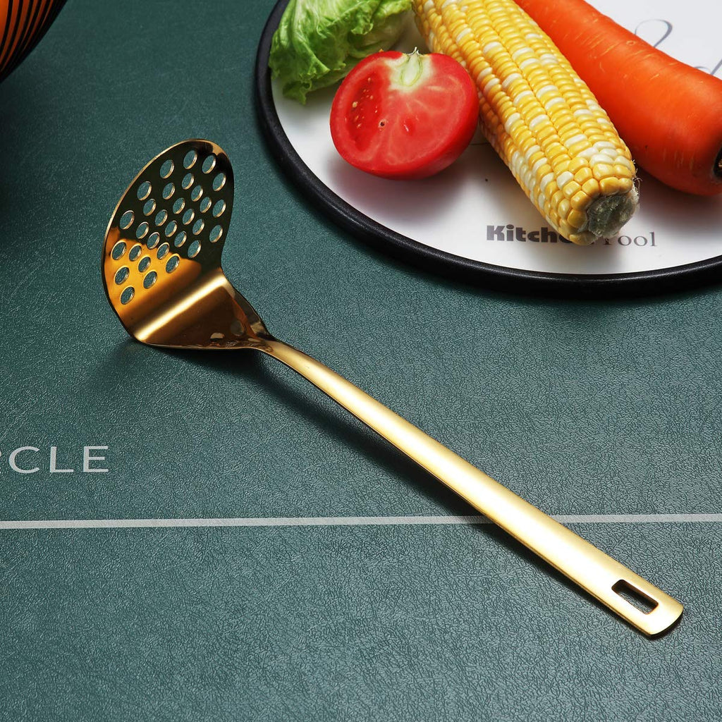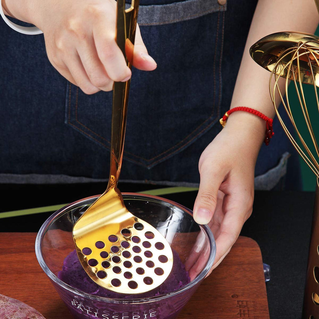 Dieses Goldfarbene Kochutensilien Set beinhaltet 13 Stücke aus hochwertigem Edelstahl, beschichtet mit Titan für zusätzliche Langlebigkeit.