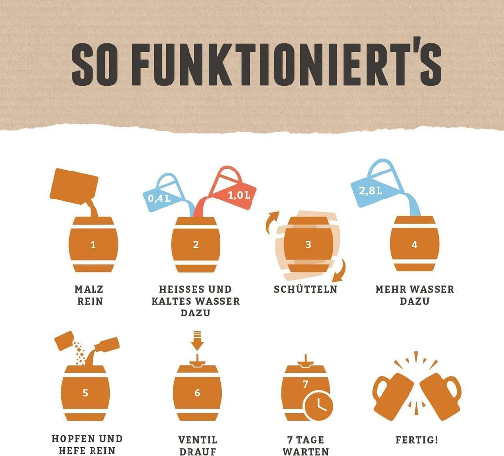 - ✔ The all in-one set contains all ingredients and appliances. All you need is water to brew your beer in the 5-litre barrel.
