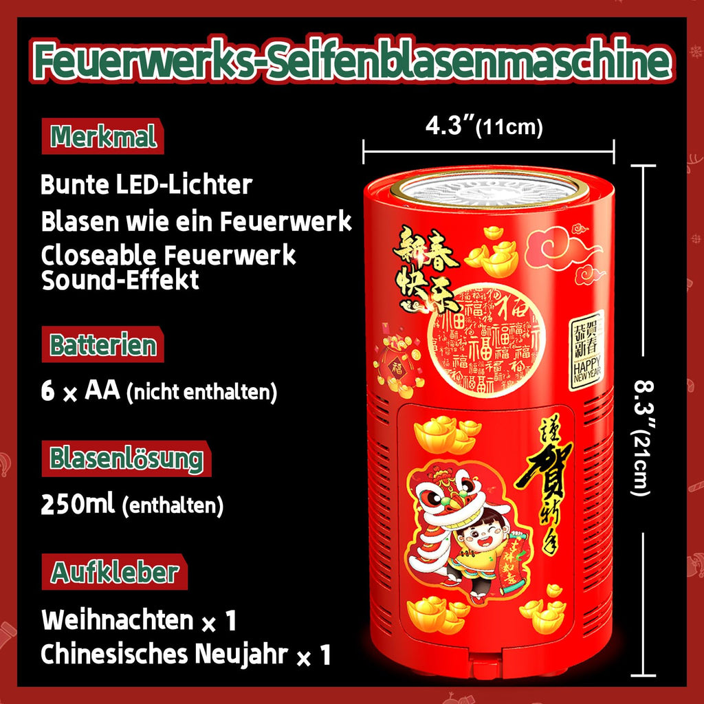 - 【Für jeden Anlass geeignet】Die Seifenblasenmaschine eignet sich perfekt für verschiedene Veranstaltungen wie das chinesische Neujahr, Weihnachten, Partys, Hochzeiten und vieles mehr. Sie verleiht Ihrem Fest eine einzigartige Note und schafft unvergessliche Erinnerungen für Sie und Ihre Lieben.