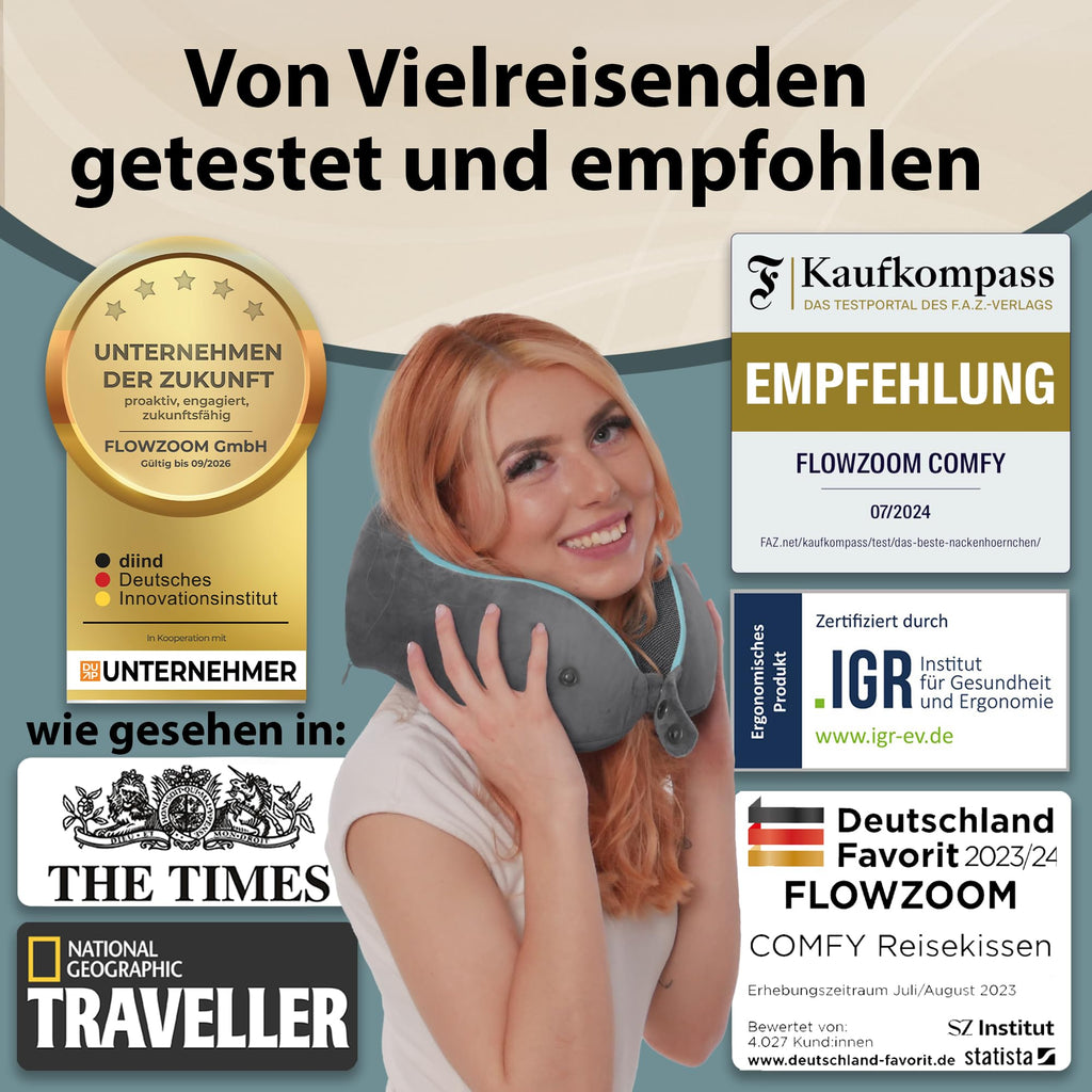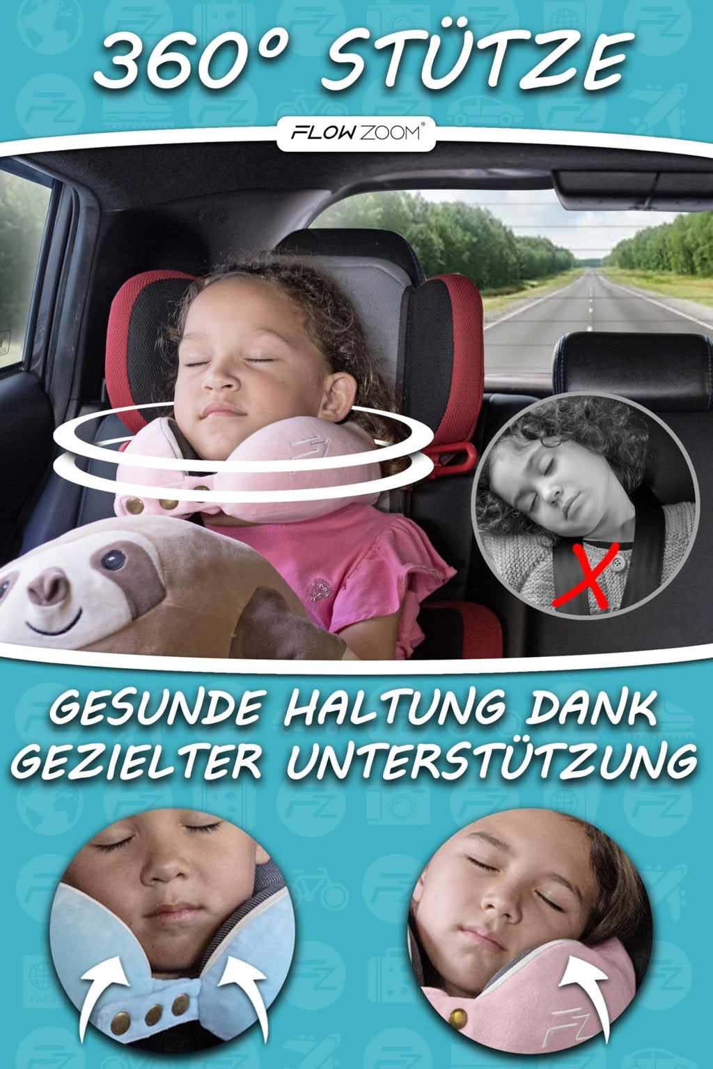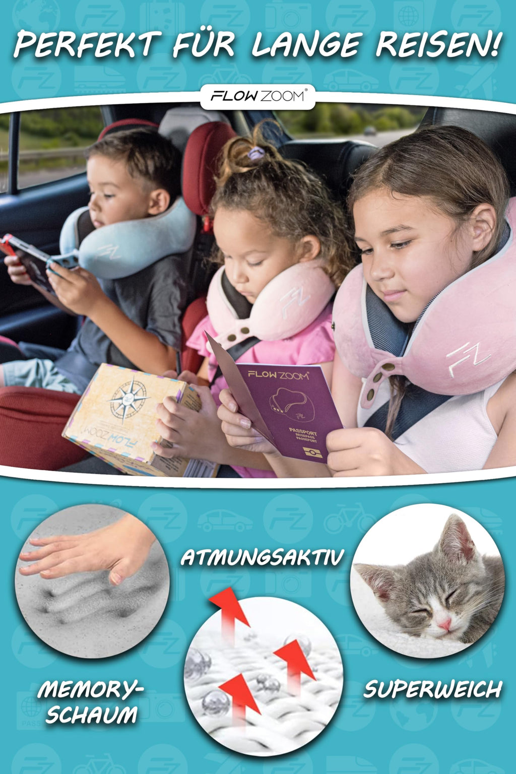• EINZIGARTIGES DESIGN - das FLOWZOOM Nackenkissen hält den Kopf in perfekter Position dank der extra schmalen Rückseite, die im Vergleich zu anderen Flugzeug Kissen den Kopf NICHT NACH VORNE DRÜCKT.
