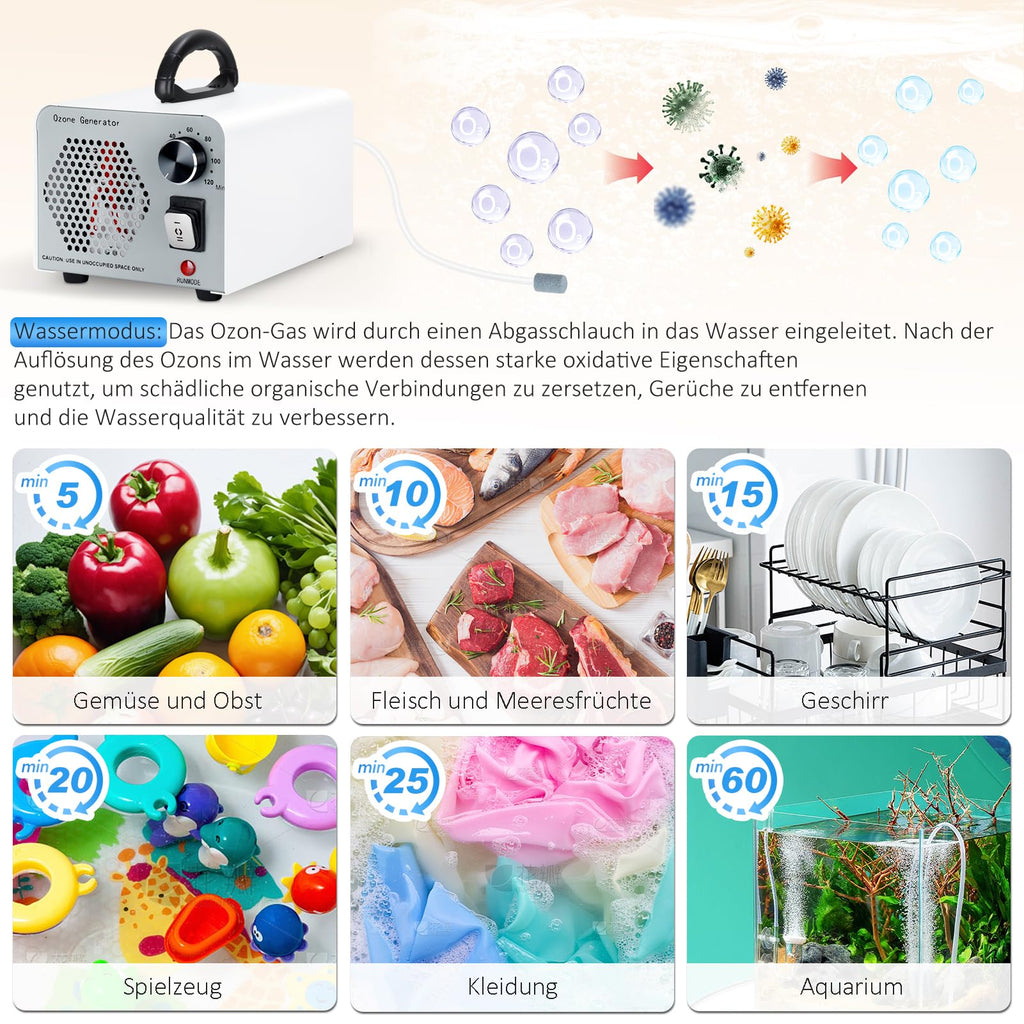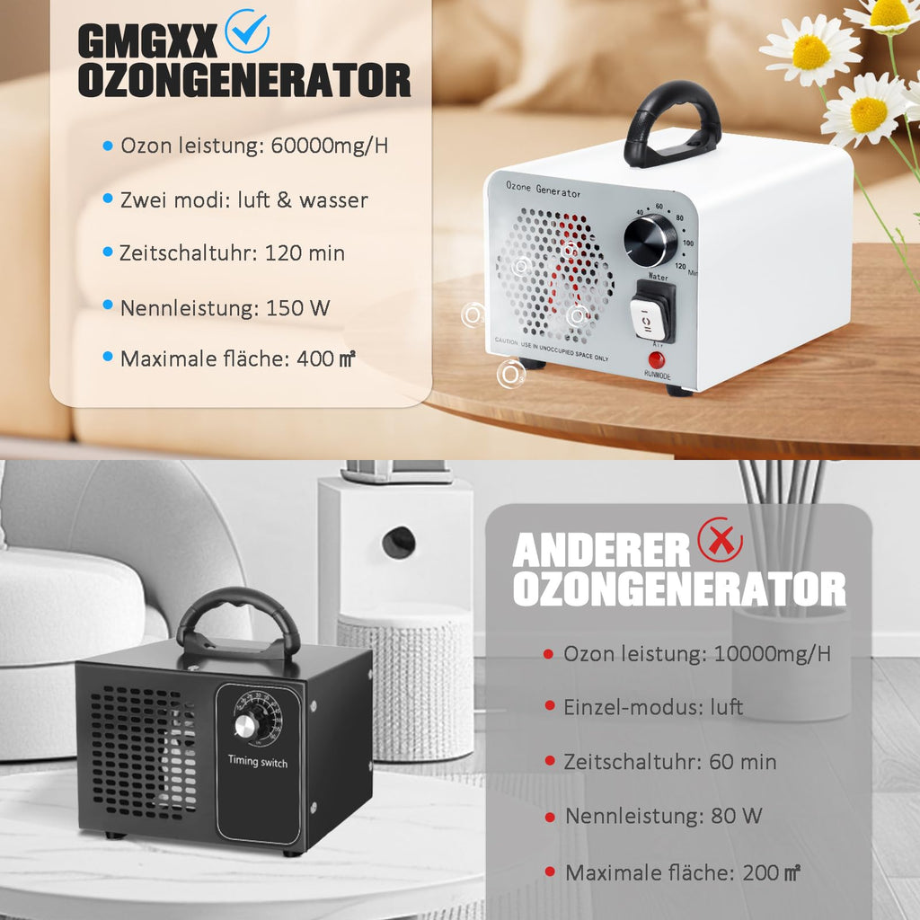 - đăHochwertig und Leistungsorientiertă: Der âLuftâ-Modus des OzongerĂ€t kann 60.000mg/H Ozon mit einem Reinigungsbereich von bis zu 400 㥠liefern, und der âWasserâ-Modus kann 1000mg/H Ozon liefern. Im Vergleich zu anderen Ozone generator ist die Ozonleistung gröĂer und die Reinigungsleistung höher. Er kann GerĂŒche und schĂ€dliche Gase wie Rauch, Haustiergeruch, Kochgeruch, Schimmel, Formaldehyd und andere schĂ€dliche Gase schnell beseitigen und bietet Ihnen ein angenehmes und sauberes Wohnumfeld.