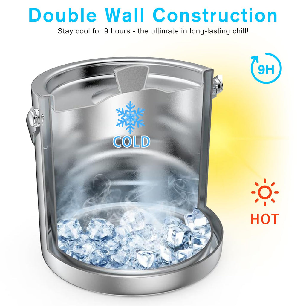 Mit seiner doppeltwandisolierten Struktur und dem Edelstahldeckel bietet dieser Eiskübel eine hervorragende Kühlleistung. Es hält Ihre Getränke nicht nur erfrischend kalt, sondern reduziert auch die Kondensation auf der äußeren Oberfläche. Dieses innovative Design sorgt dafür, dass Ihre Getränke länger kühler bleiben und macht sie zur idealen Wahl für jede Versammlung oder Veranstaltung.
