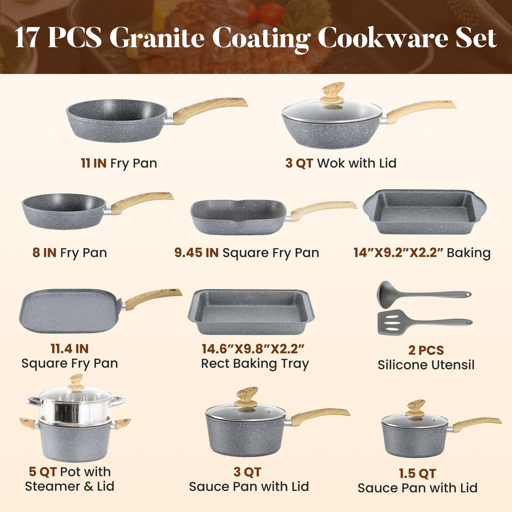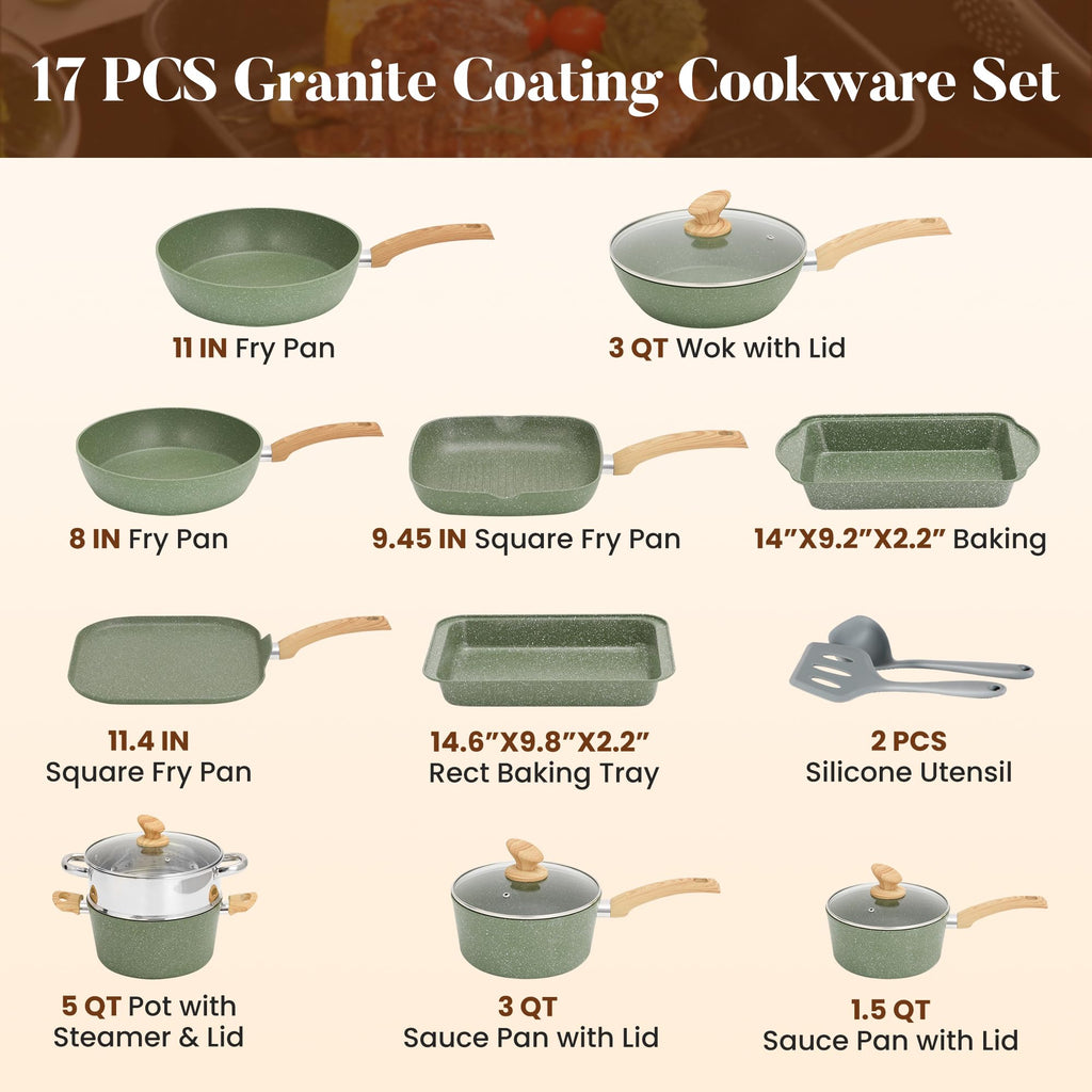 Dieses 30-teilige oder 17-teilige Non-Stick Induktionskochgeschirr und Kochgeschirr Set verfügt über eine langlebige Granitbeschichtung, die für eine gleichmäßige Hitzeverteilung sorgt. Genießen Sie eine mühelose Reinigung dank der Antihaftbeschichtung. Perfekt für alle, die eine schnelle und einfache Zubereitung von Speisen schätzen.