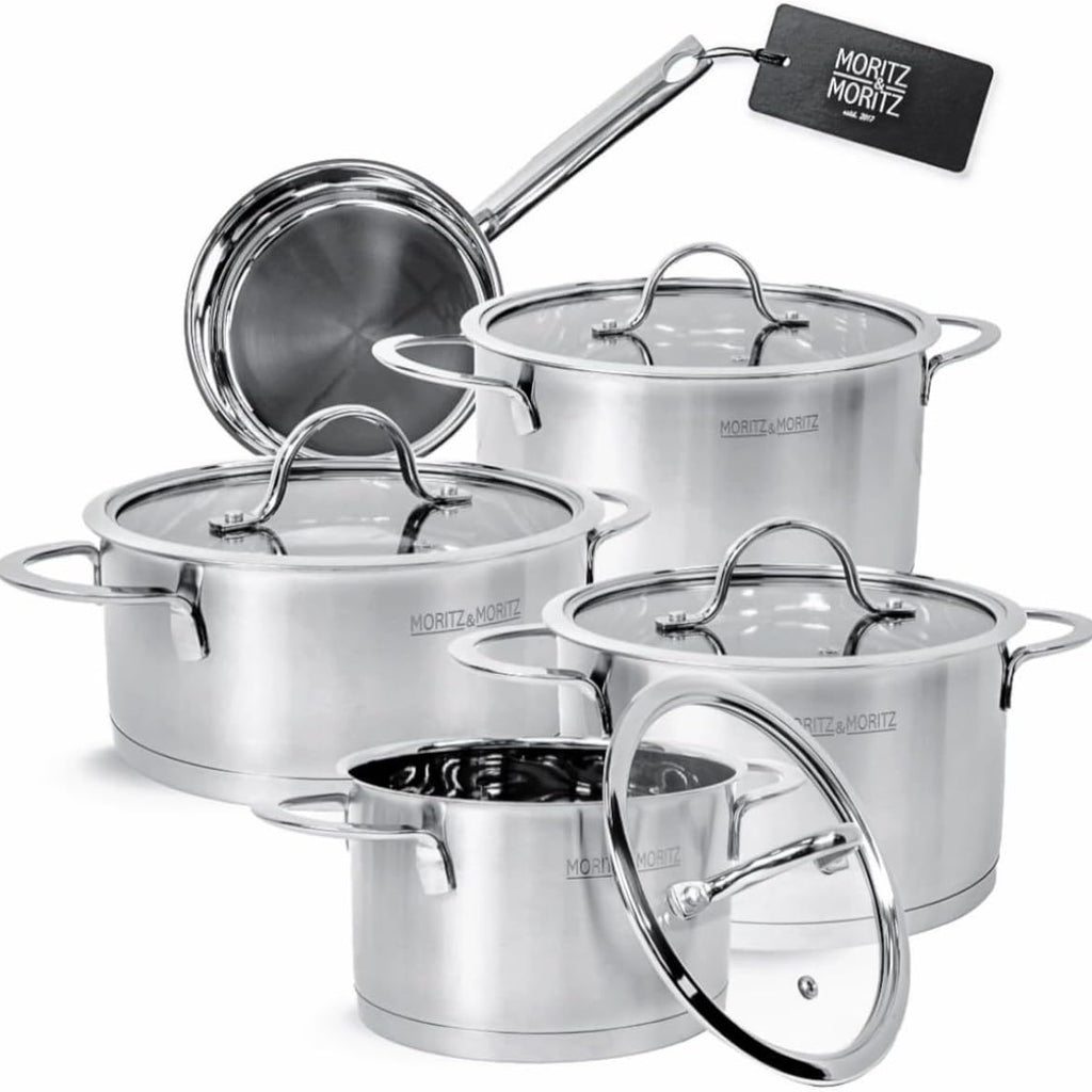 Text: 'MORITZ MORITZ Cooking'. Professional cookware display with stainless steel pots and pans arranged on wooden surface.