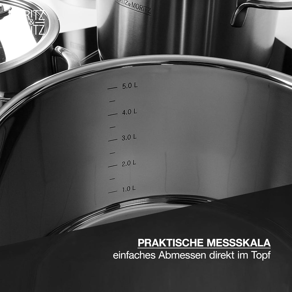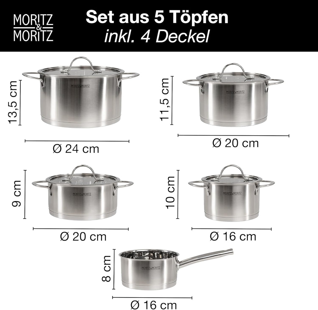 Text reads 'MORITZ&MORITZ TOPFSET 5 tlg.' Duplicate image of the cookware set with identical text overlay and product details.