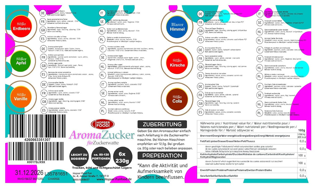 - ✨ Best ingredients – Our irresistible tasting set combines the most popular cotton candy creations from our house: cherry, vanilla, strawberry, bubblegum, apple and cola! The sugar has a long life and you have enough time for use. Each of these varieties is handmade with high-quality sugar from Südzucker according to traditional crafts, and all this directly here in Germany - it couldn't be better.