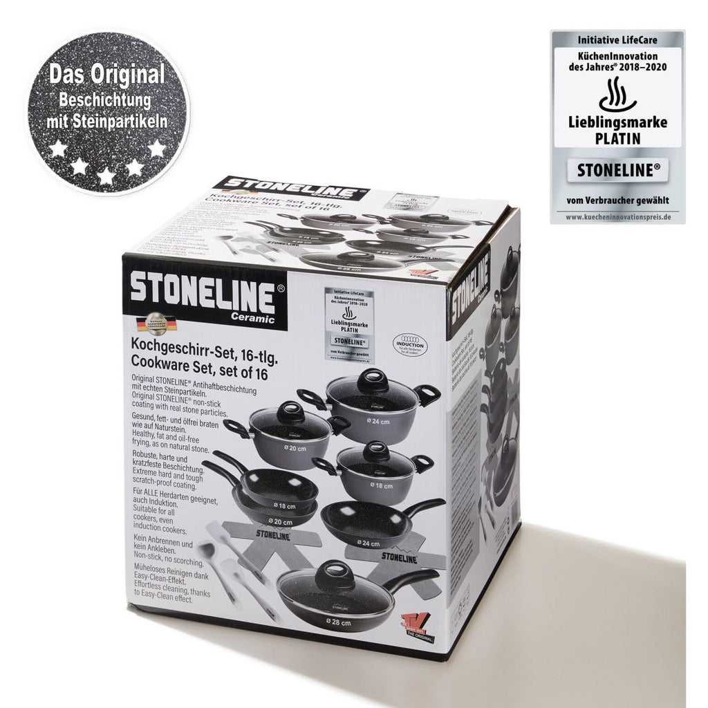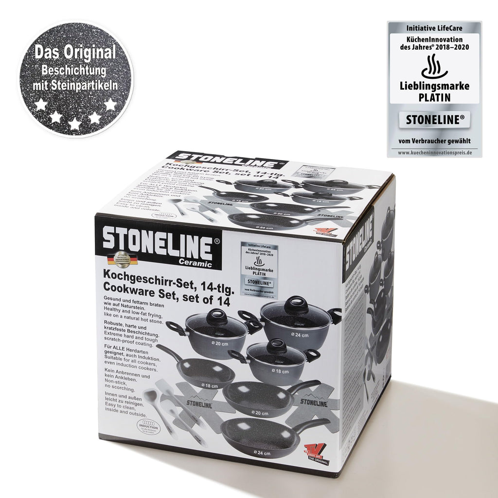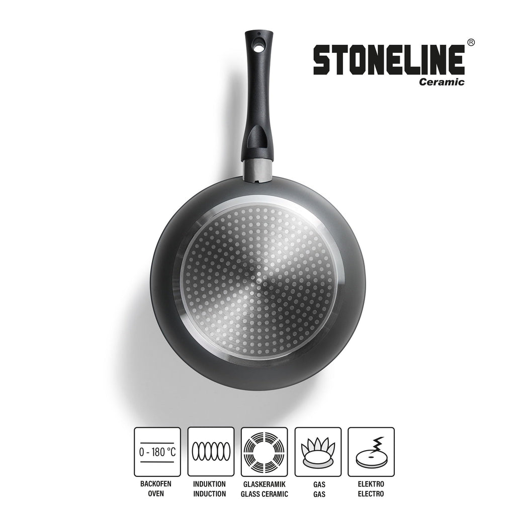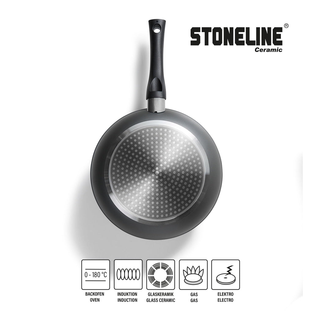 PFAS FREE CERAMIC COATING Das Keramik-Kochgeschirr ist mit der PFAS-freien und kratzfesten STONELINE Keramik-Antihaftbeschichtung mit echten Steinpartikeln ausgestattet. Dank der extrem harten und langlebigen Keramikbeschichtung mit Perlenwirkung sorgen die universellen Pfannen und Töpfe für lang anhaltenden Genuss bei der Zubereitung von Speisen. Die Keramikbeschichtung eignet sich zum Flambieren und ist bis 450°C hitzebeständig.