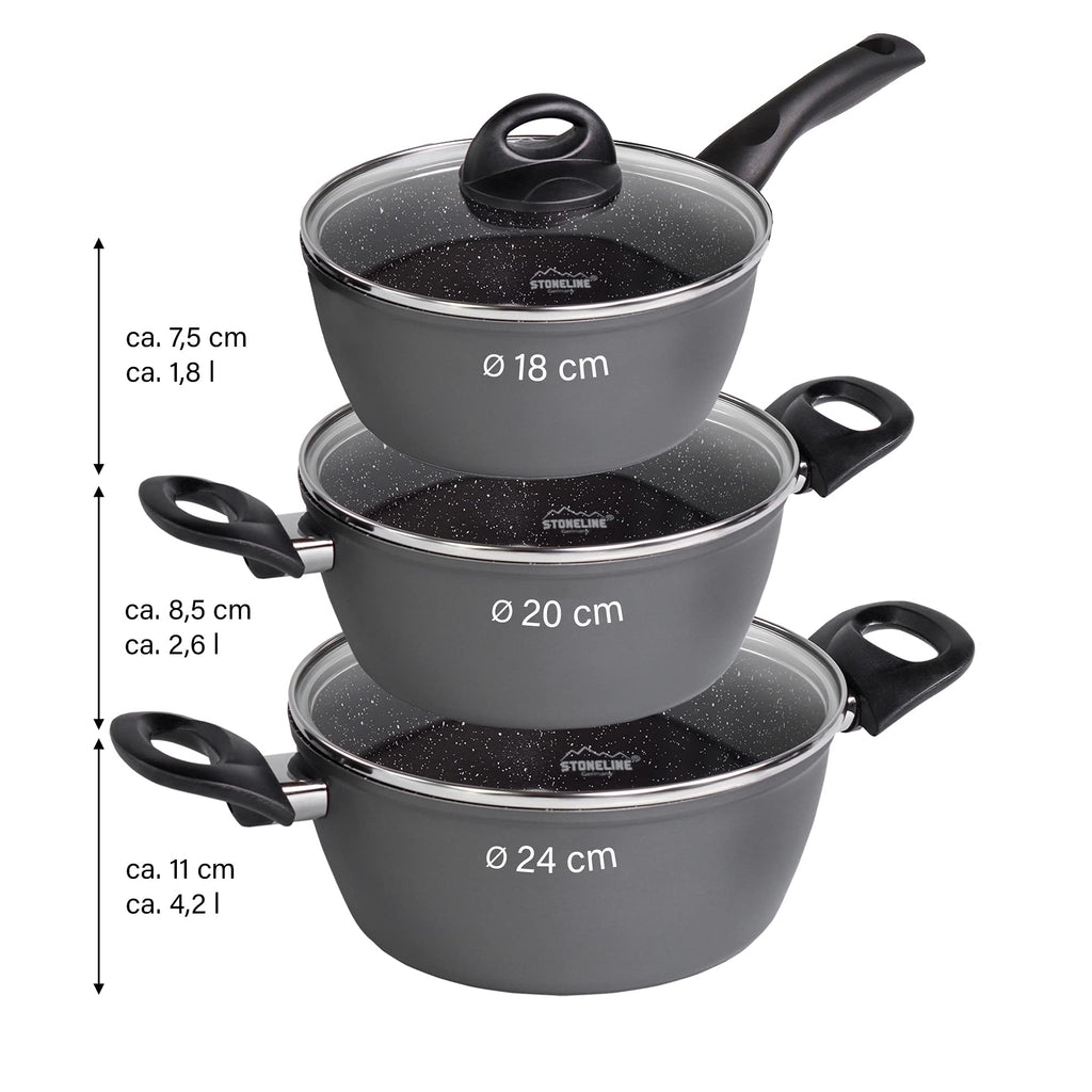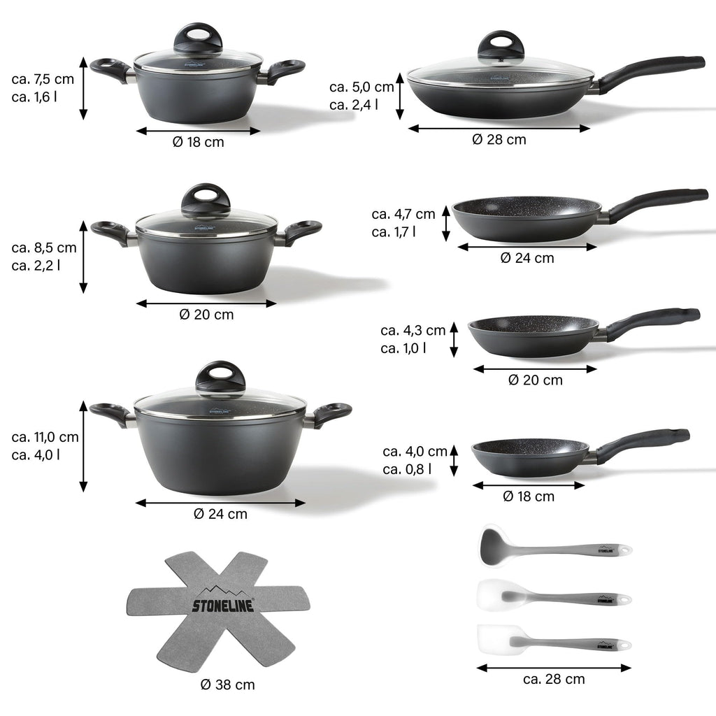 Inhalt der Box: 3 x Kochtöpfe, Durchmesser ca. 18 / 20 / 24 cm, Höhe ca. 7,5 / 8,5 / 11 cm, Kapazität ca. 1,8 l / 2,6 l / 4,2 l; 3 x Bratpfannen, Durchmesser ca. 18 / 20 / 24 cm, Höhe ca. 4 / 4,3 / 4,7 cm; Kapazität ca. 0,8 l / 1,0 l / 1,7 l; 3 x Glasdeckel, Durchmesser ca. 18 / 20 / 24 cm; 2 x Panprotektoren, Durchmesser ca. 38 cm; 1 x Schaber, 1 x Kochlöffel, 1 x Suppenpfanne; Materialpfannen und Töpfe: Aluminium, Keramik beschichtet; Griffe: Kunststoff, Farbe: Schwarz