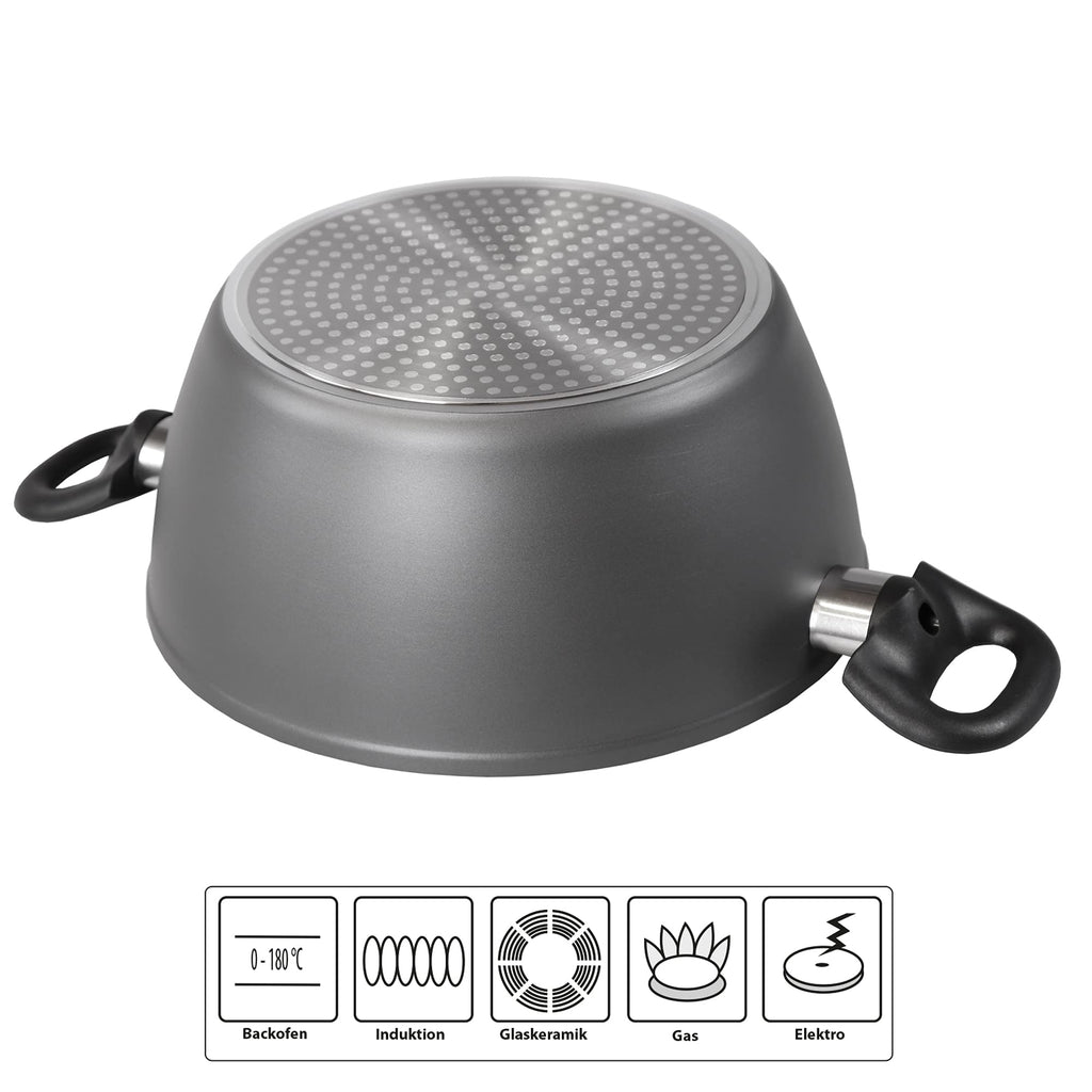 Geeignet für alle Kochfeldtypen: geeignet für Induktions-, Gas-, Elektro- und Glaskeramik-Häufer mit besonders starker, energiesparender und warpfreier Basis. Die Basis sorgt für eine optimale Wärmeverteilung. Dank der Beschichtung brennt das Essen im Kochgeschirr nicht. Geeignet für Induktion mit kühlen Griffen während des Kochens und für den Einsatz im Ofen bis 180°C.
