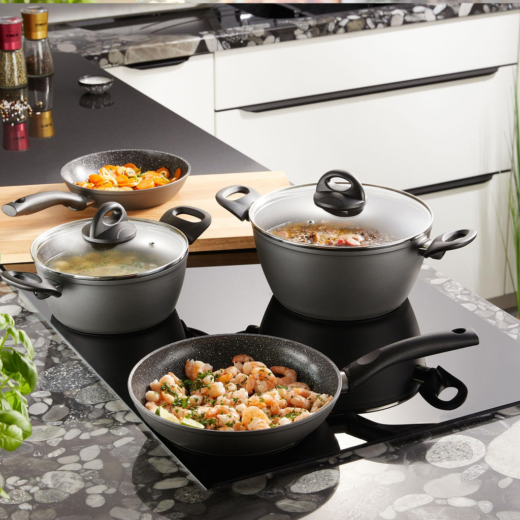 Gesund mit niedrigem Fettgehalt und Öl: Steinlinien-Keramik-Kochgeschirr kann auf vielfältige Weise für alle Röst- und Schmoren verwendet werden. Mit den universellen Pfannen und Töpfen können Fleisch, Fisch und Gemüse gebraten und gesund und vitaminfreundlich gekocht werden. Dank ihrer schnellen Wärmeleitfähigkeit erwärmen sich die Pfannen und Töpfe sehr schnell und kochen energiesparender.