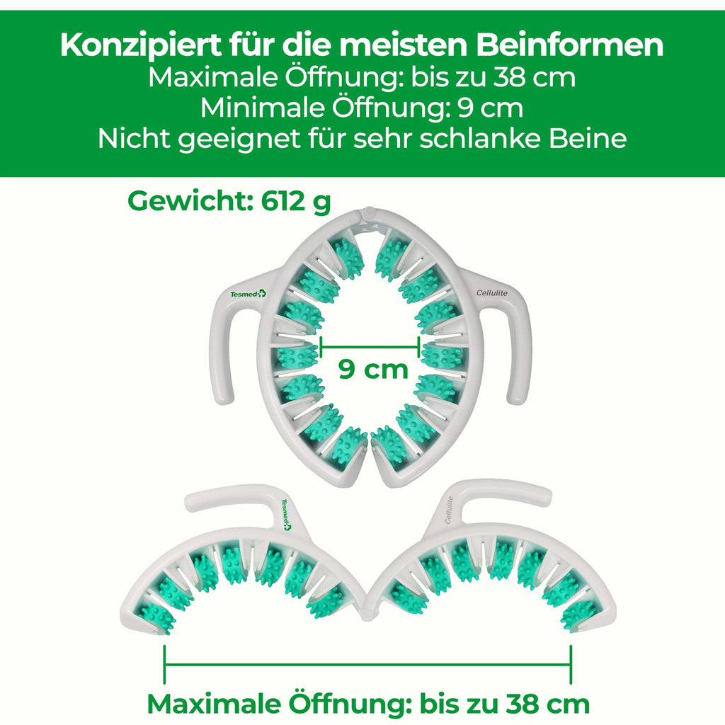 - ⏱️ SCHNELL UND ERGONOMISCH Nur 3 Minuten pro Bereich in Ihrer täglichen Routine. Die ergonomische Form und die verstellbare Breite (9–38 cm) machen dieses Anti Cellulite Massagegerät perfekt für Behandlungen an Oberschenkeln, Gesäß und Bauch. Tesmed Cellulite umschließt den gesamten Oberschenkel – für eine vollständige und tiefenwirksame Anwendung in nur einem Zug.