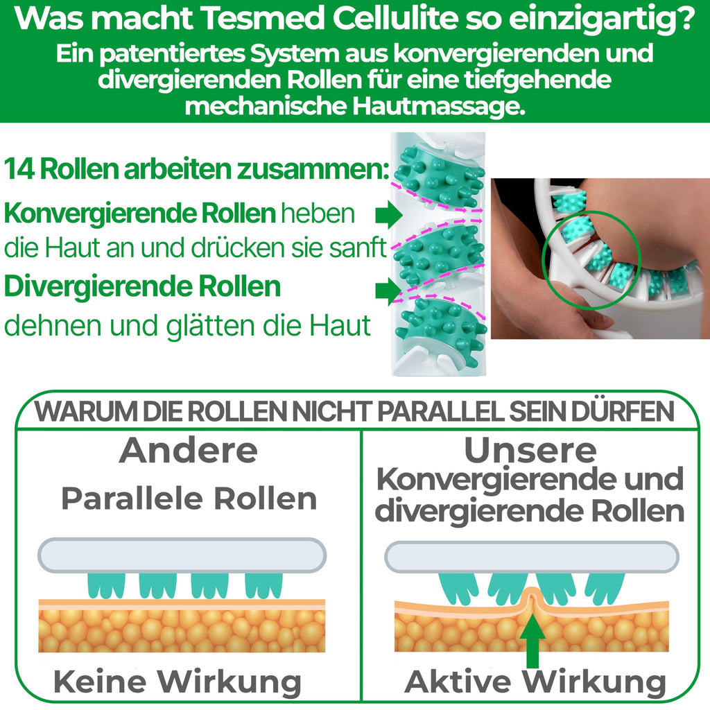 - PATENTIERTE TESMED-TECHNOLOGIE Die konvergierenden und divergierenden Rollen des Massage Rollers führen die Haut zwischen sich, heben sie an und drücken sie abwechselnd zusammen. Dieser patentierte Massageroller stimuliert das Gewebe tiefenwirksam – das ist es, was ein gutes Anti Cellulite Massagegerät wirklich effektiv macht, im Gegensatz zu einfachen Geräten mit parallelen Rollen, die nur oberflächlich wirken.