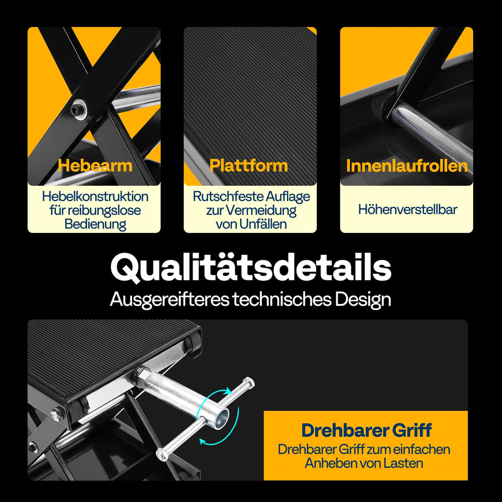 Die breite Plattform und die Kurbel erleichtern das Anheben und Arbeiten an Ihrem Fahrzeug.