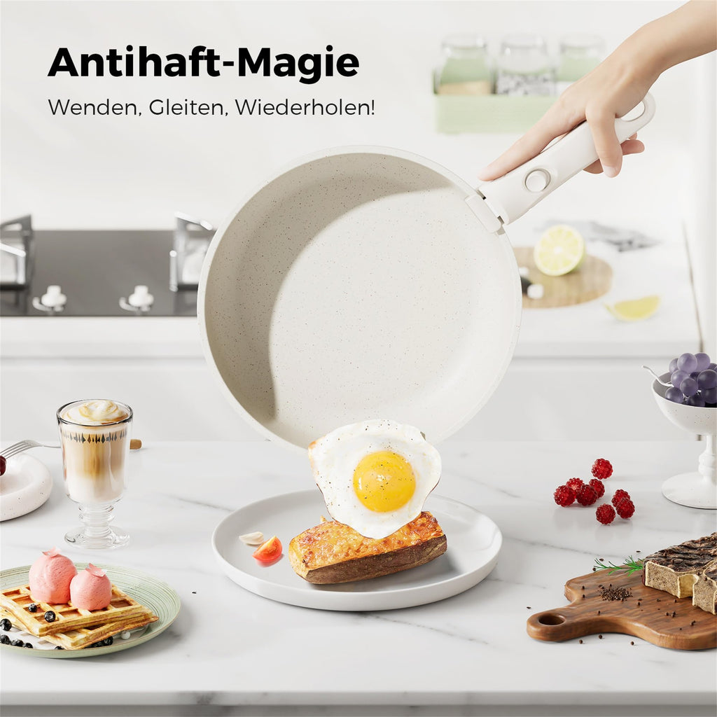 - Abnehmbare Griffe zur Platzersparnis: Erleichtern das stapelbare Verstauen und ermöglichen die sichere Nutzung der Töpfe im Backofen.